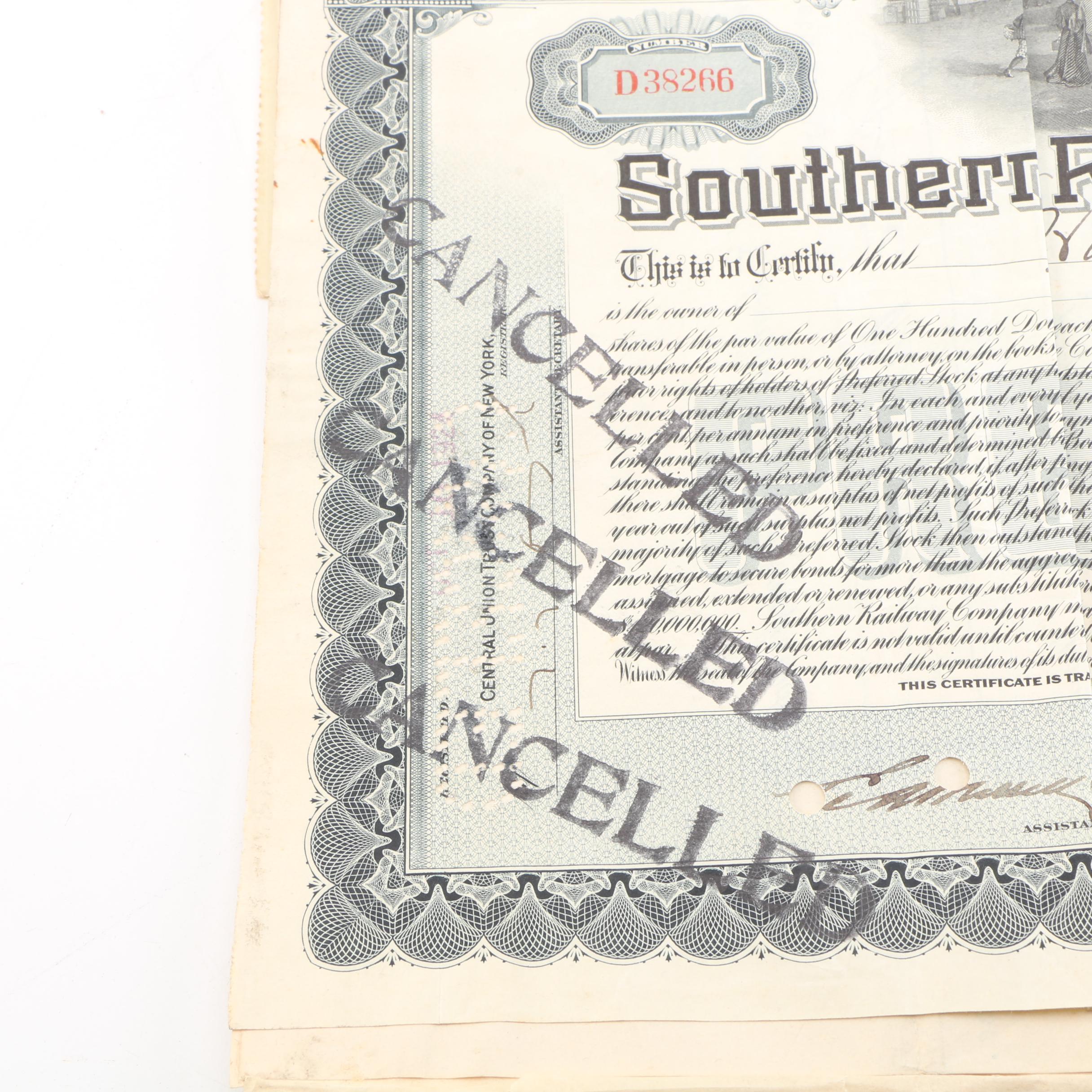 1924 and 1931 Southern Railway Company Cancelled Stock Certificates EBTH