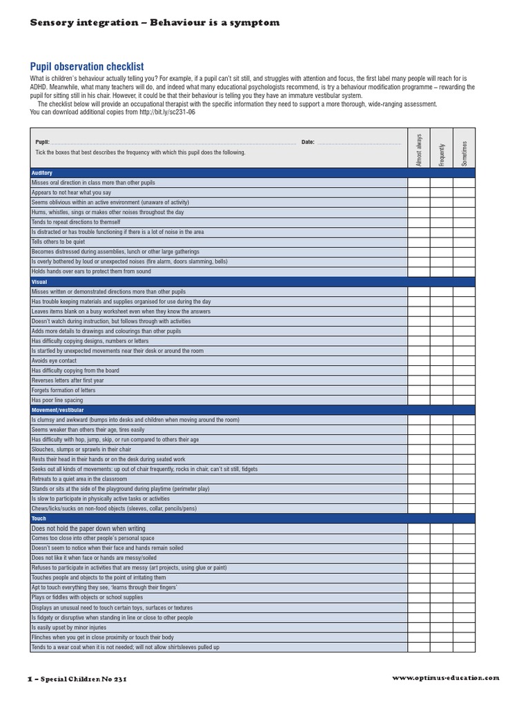 Sensory Integration Checklist PDF Sensory Processing Disorder