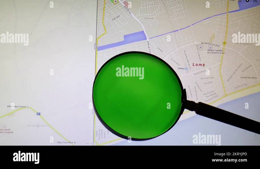 Togo and its capital Lome seen trough a green magnifying glass Stock