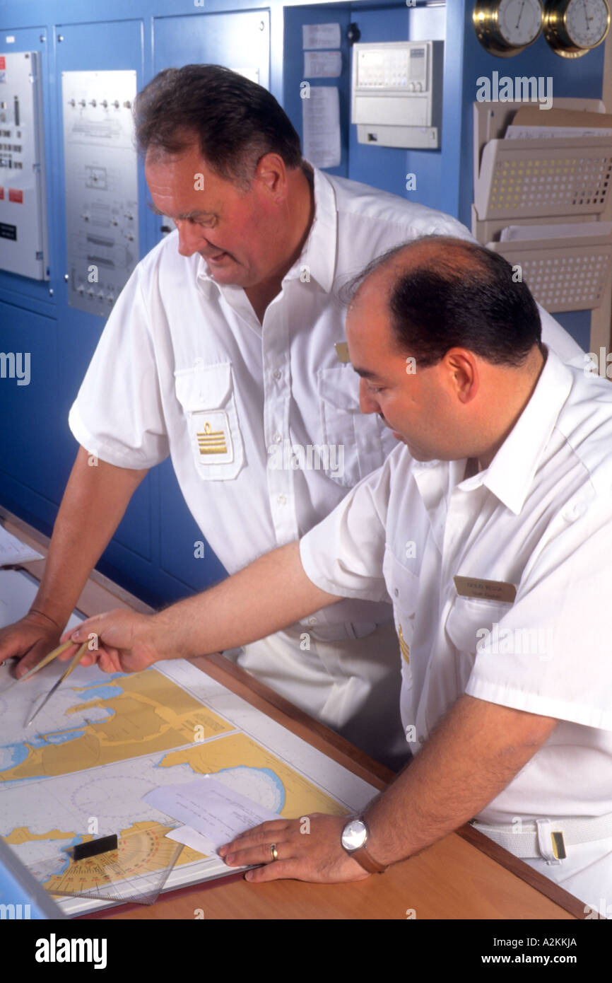 Inside cabin of various captains on cruise ship dressed in white Stock