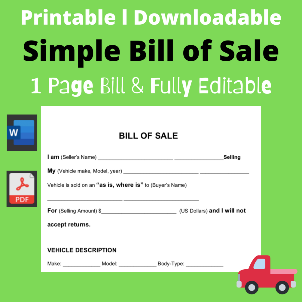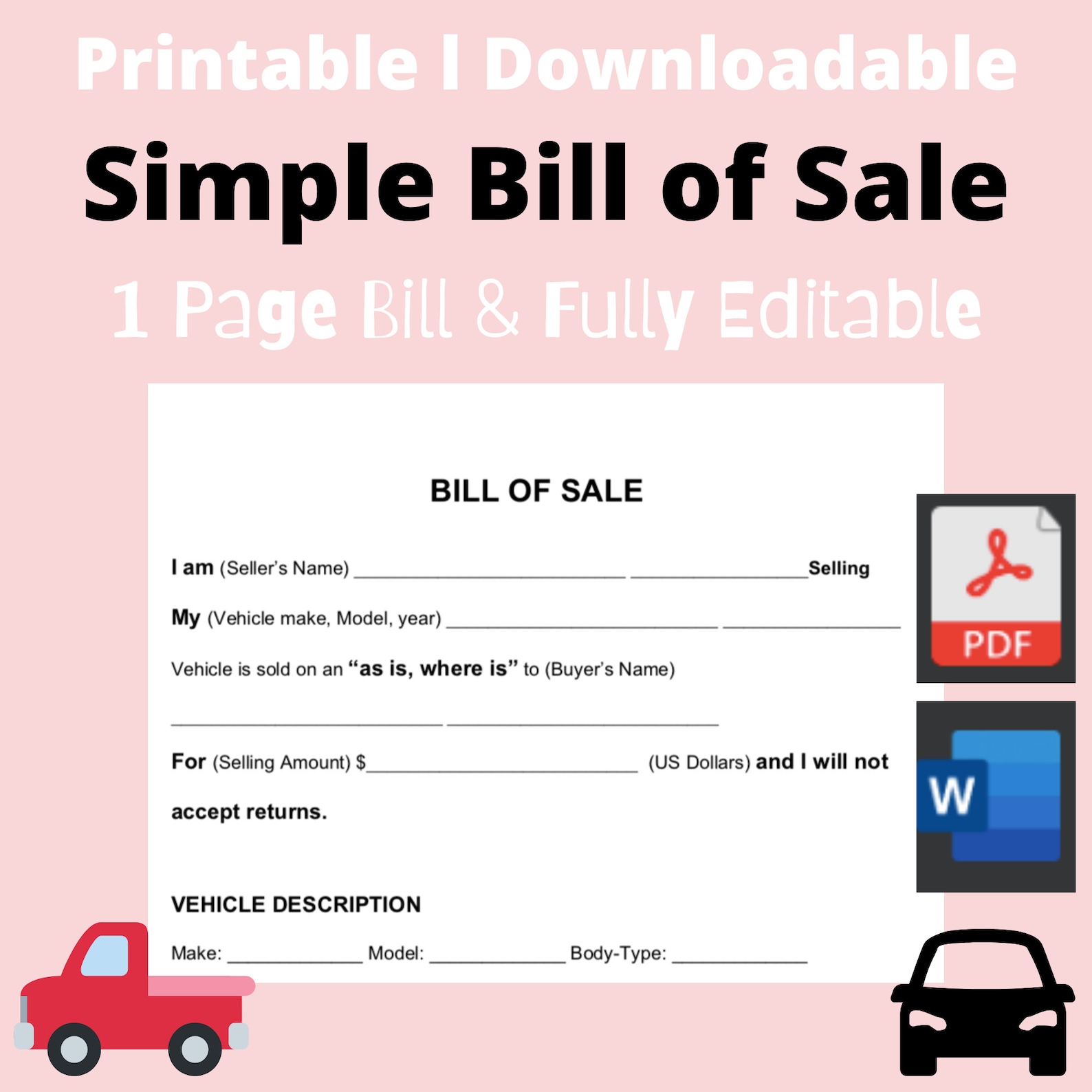 Bill of Sale for Car Truck bill of sale PDF/Word Template Printable