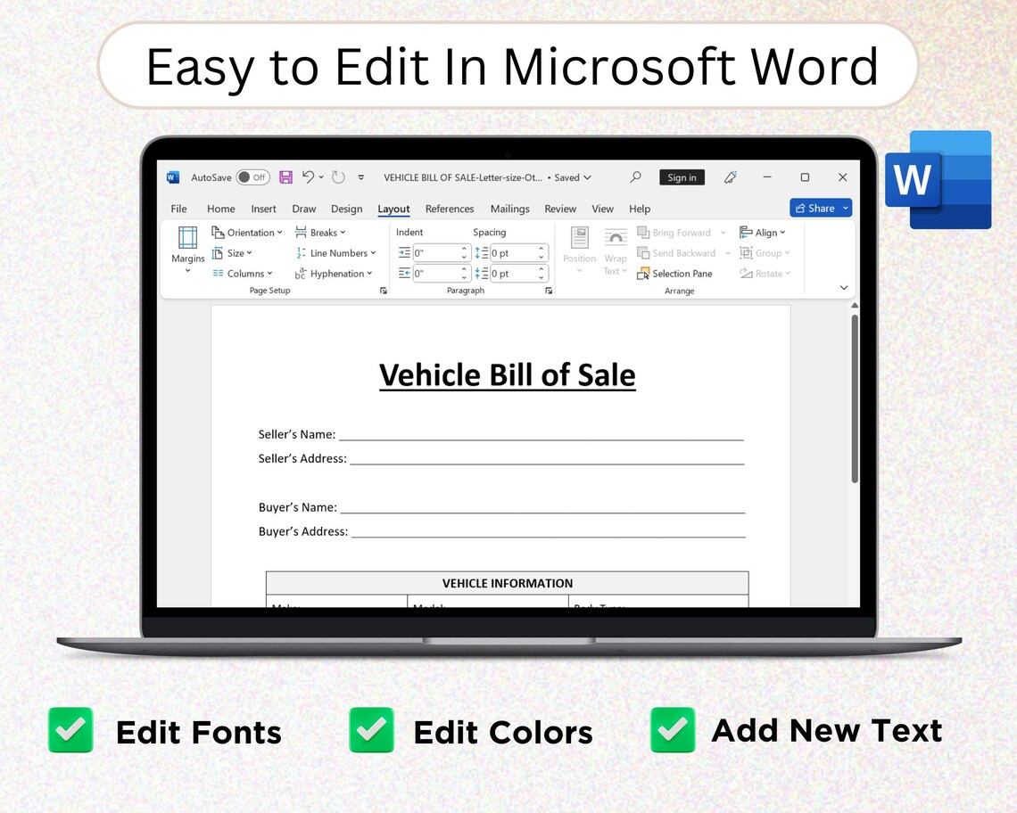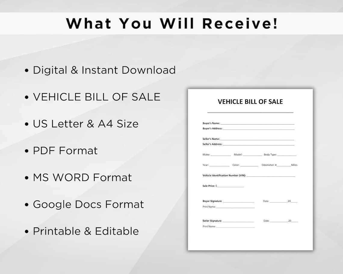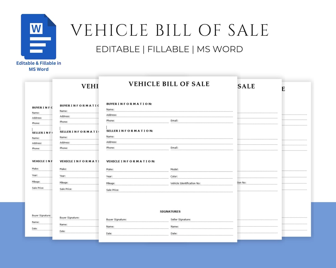 Vehicle Bill of Sale Editable Fillable in WORD PDF Bill of Sale