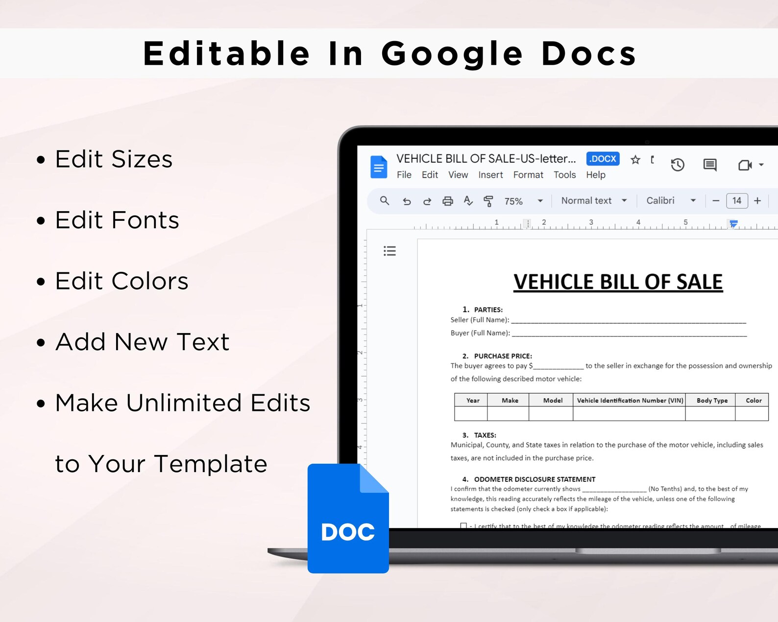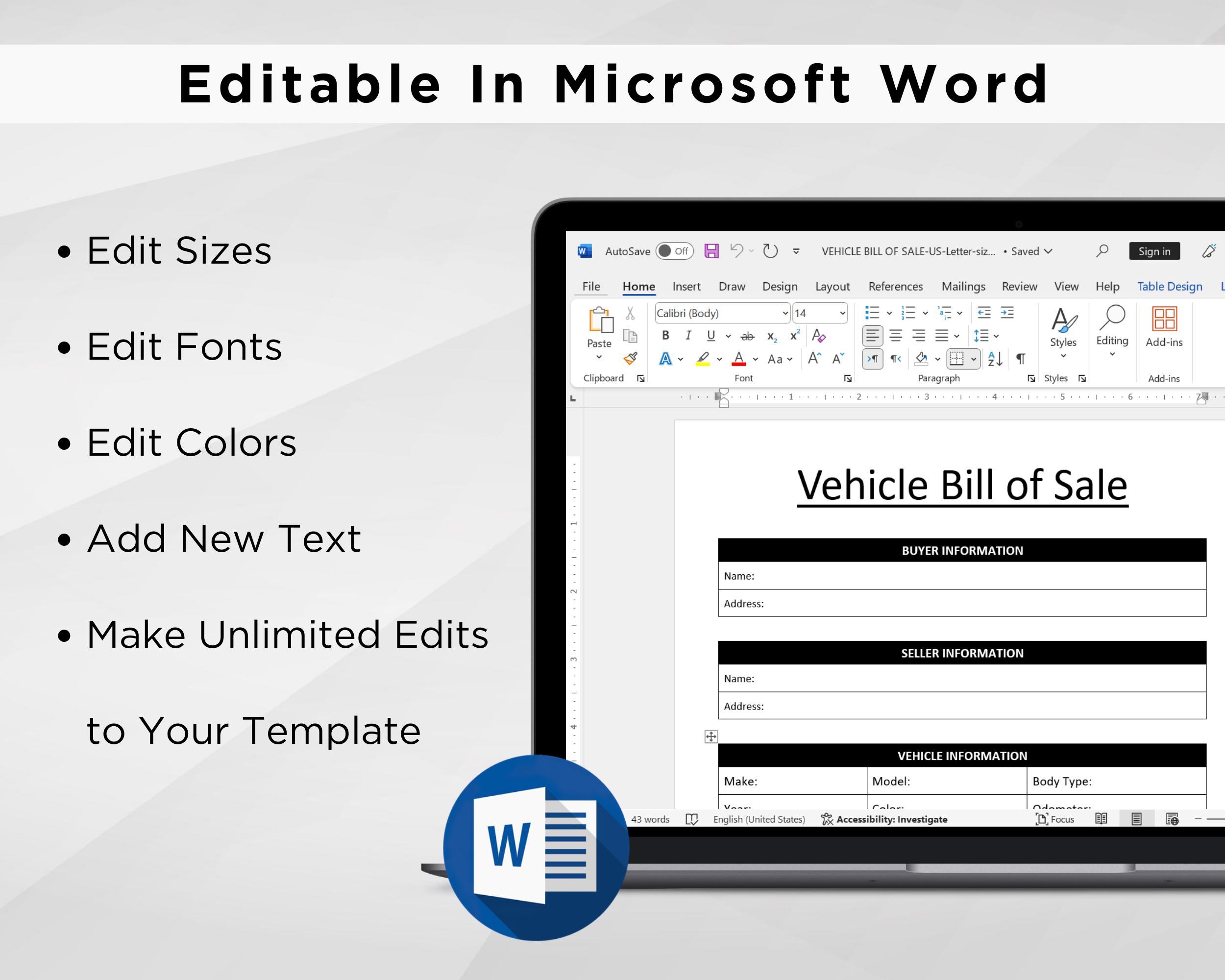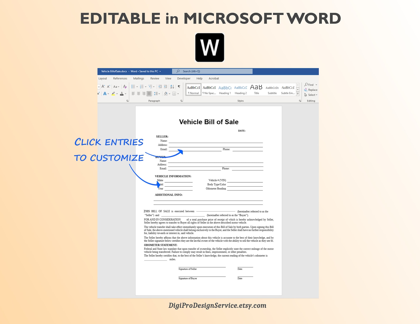 Vehicle Bill of Sale Editable Fillable in WORD PDF Bill of Sale