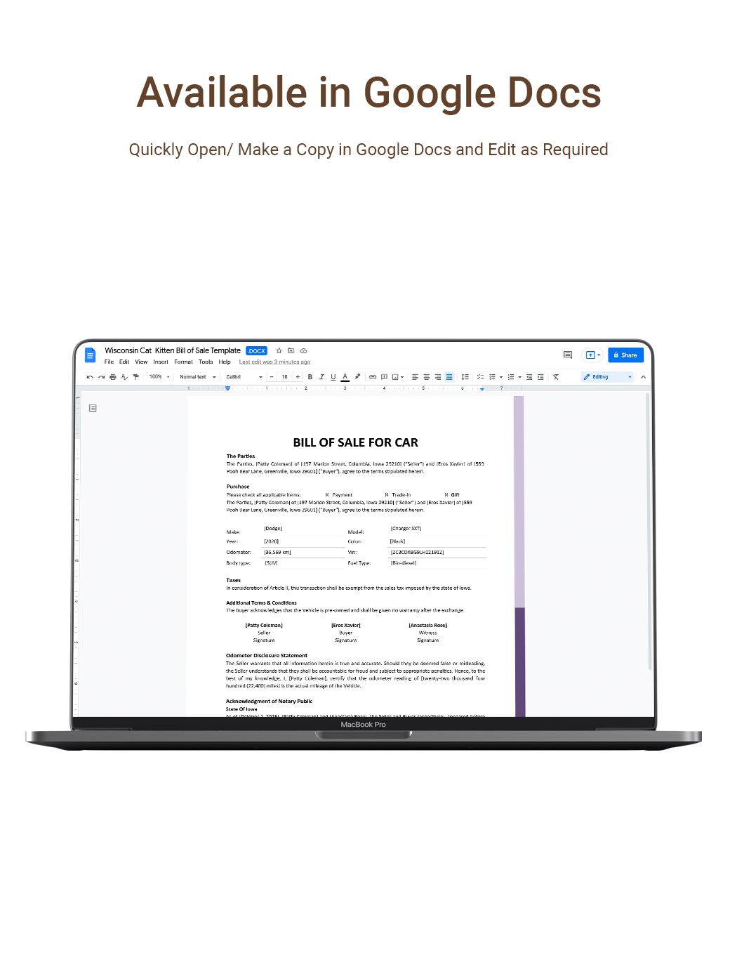 Auto Bill of Sale Template in Word PDF Google Docs Download