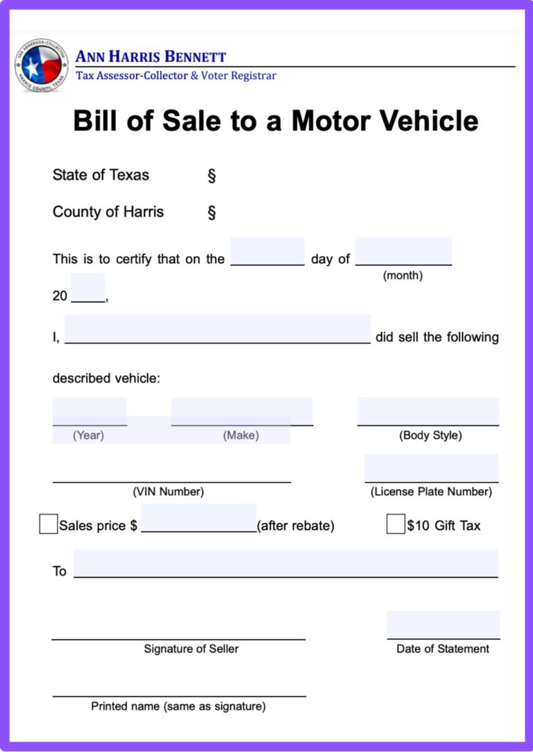 Texas Motor Vehicle Bill Of Sale Template