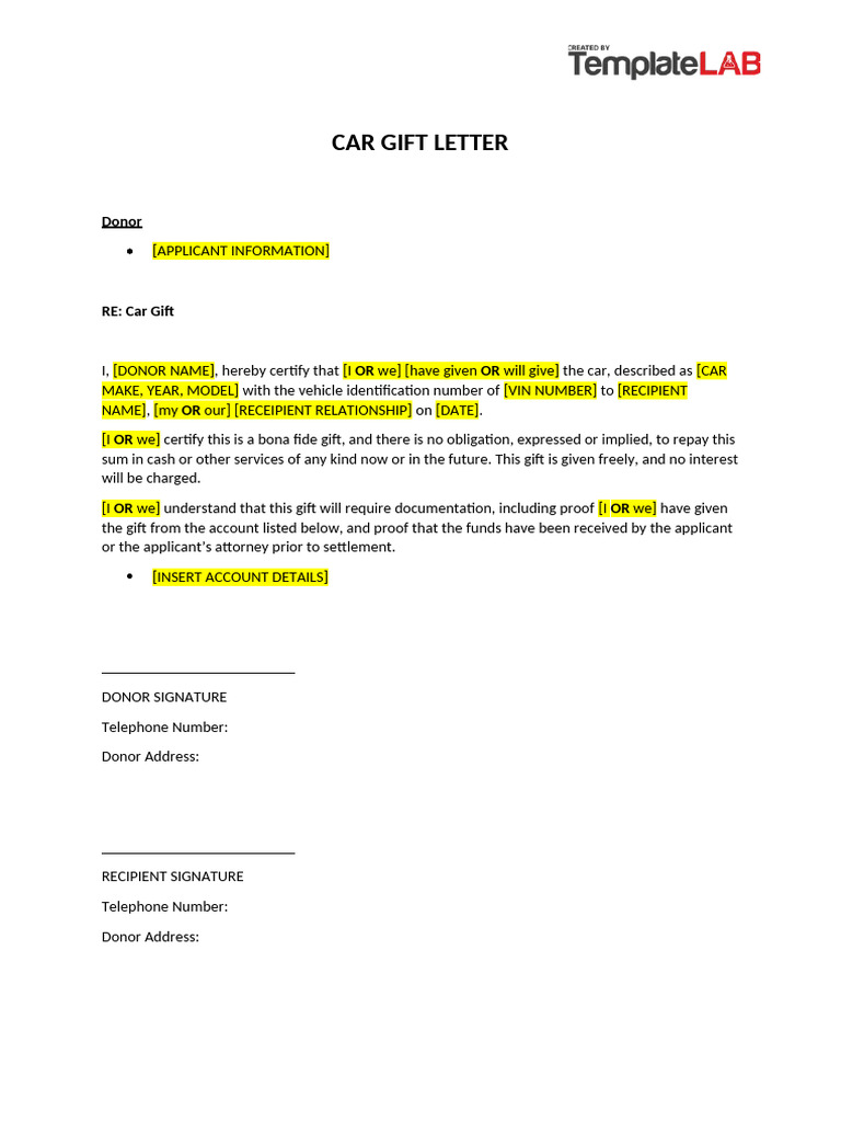 Car Gift Letter Template PDF