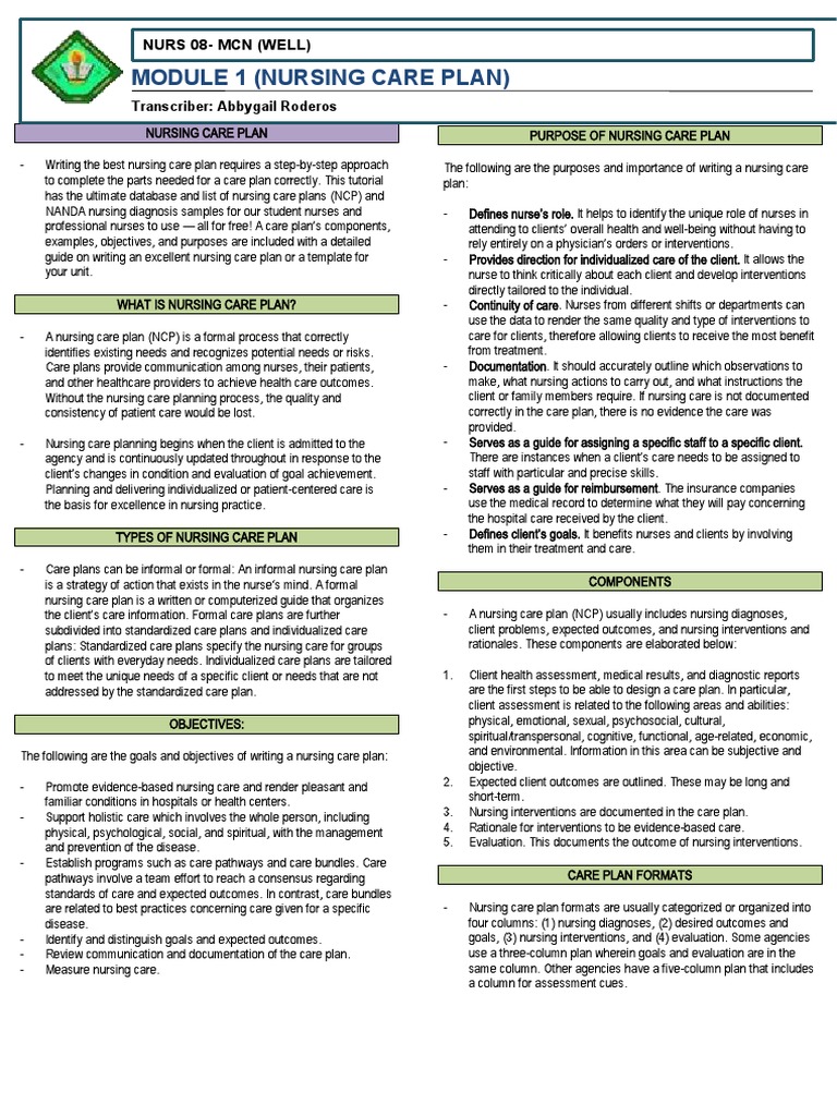 Week 1 Module 1nursing Care Plan PDF Nursing Goal