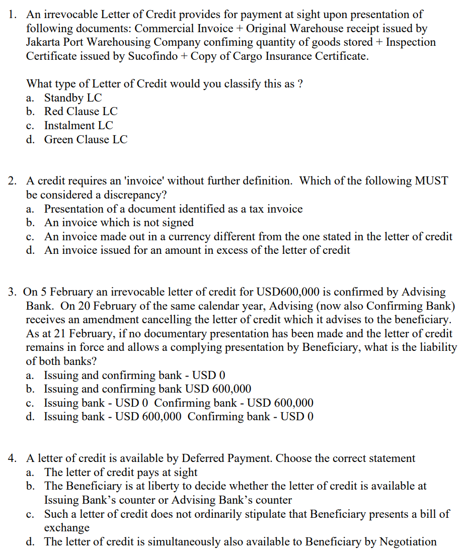 Solved 1 An irrevocable Letter of Credit provides for Chegg com