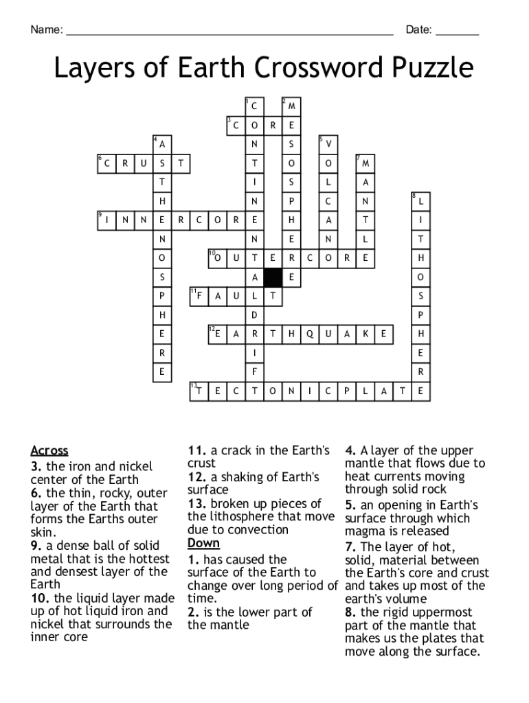 Earth Layers Science Crossword Puzzle Activity Worksheet
