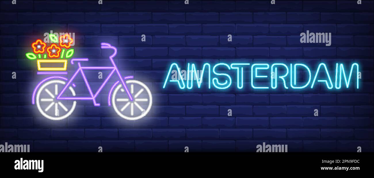 Amsterdam neon text bicycle with flowers on luggage carrier Stock