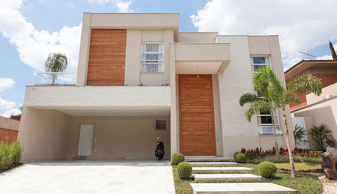 Fachada de casa contemporânea com porta de entrada clássica e tijolos