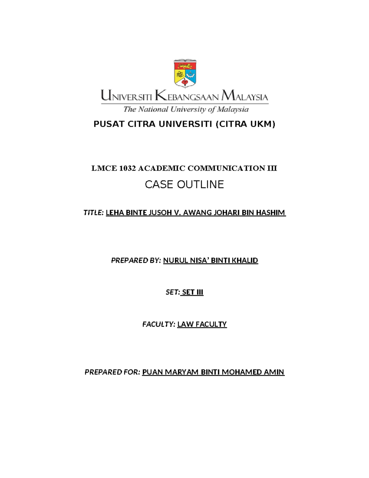 3 Case Outline Template PUSAT CITRA UNIVERSITI (CITRA UKM) LMCE 1032