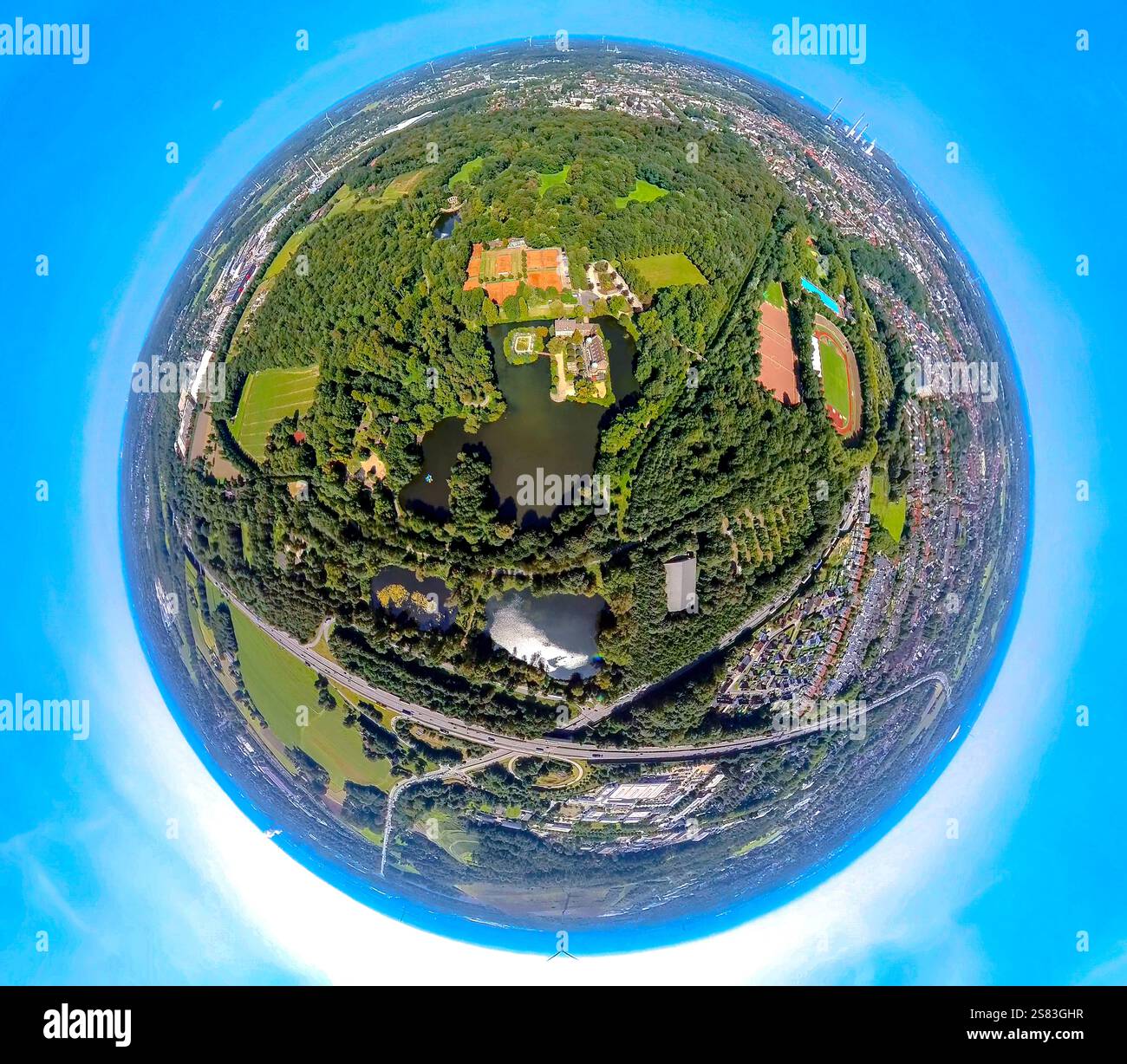 Aerial view moated castle Wittringen park and lake in the Wittringer