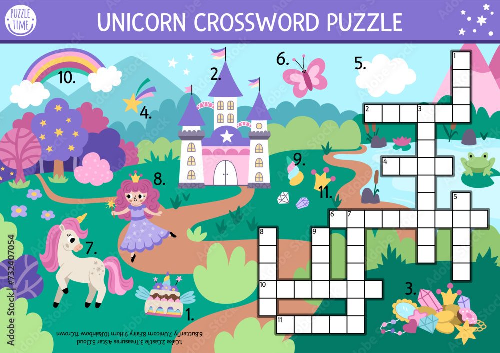 Vector unicorn crossword puzzle for kids Simple quiz with fantasy