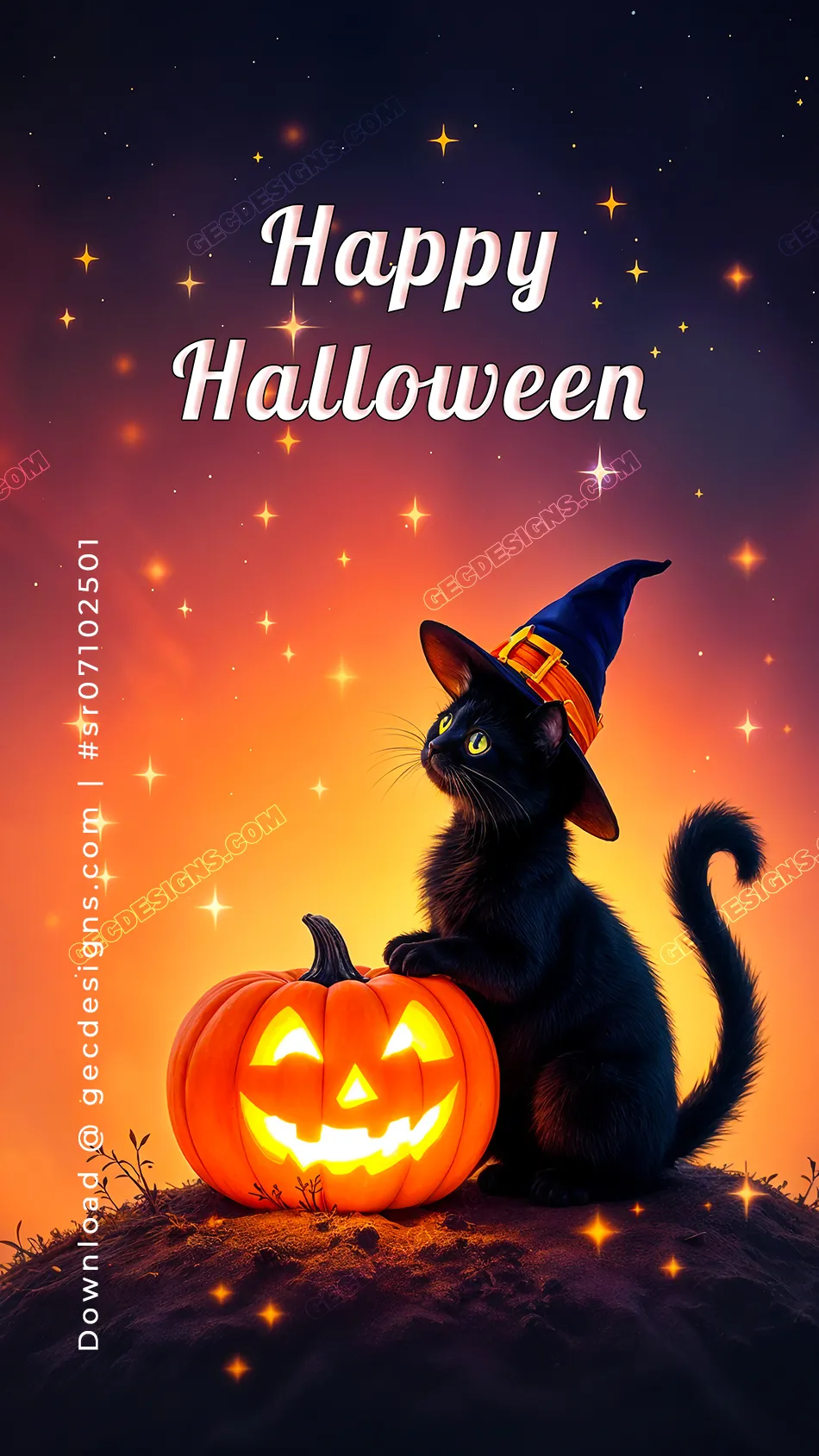 Cute Happy Halloween Image with Black Cat Witch Hat and Glowing