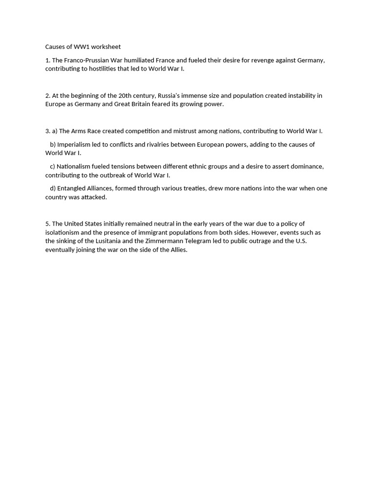 Main Causes Of Ww1 Worksheet Answers Printable And Enjoyable Learning