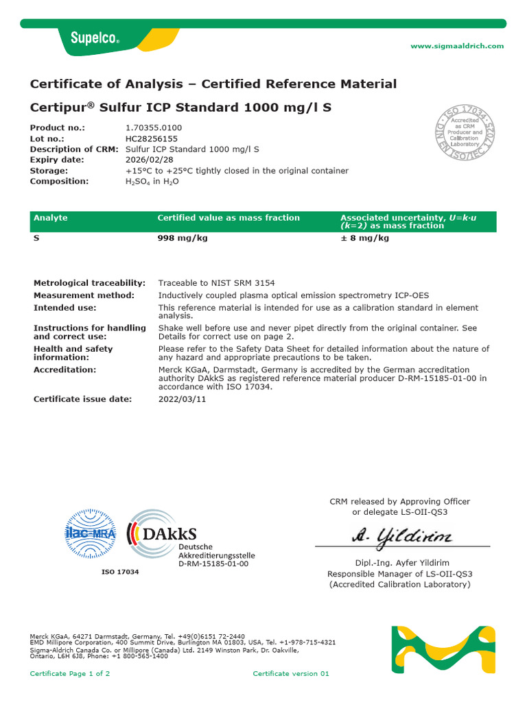 Certificate of Analysis Certified Reference Material Certipur Sulfur