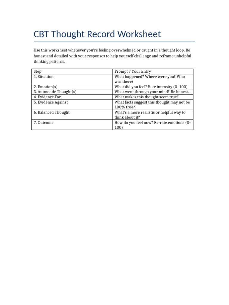 CBT Thought Record Worksheet (Editable Fillable Printable PDF