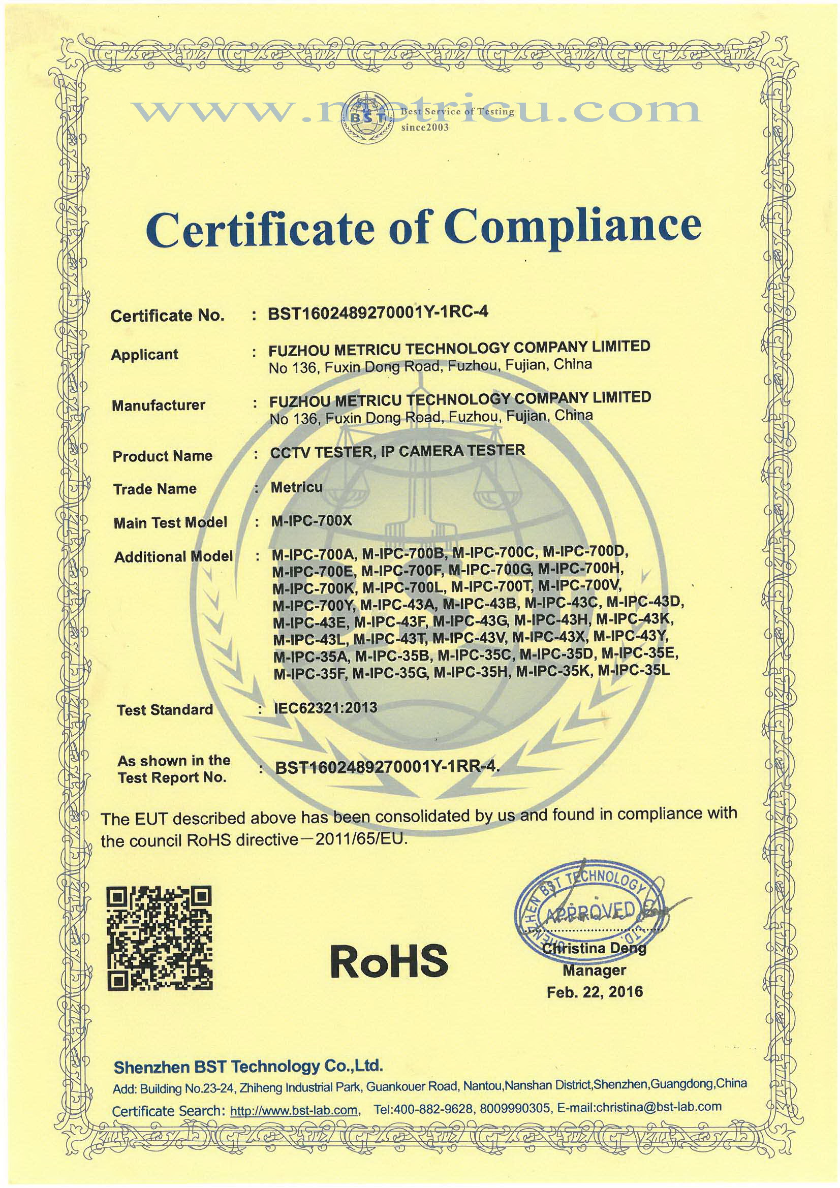 CE,FCC RoHS Certificate cctv tester ip camera tester HD TVI CVI AHD