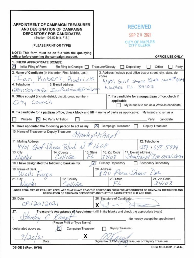 Ian Rudnick Naples City Council Candidate Appointment of Campaign
