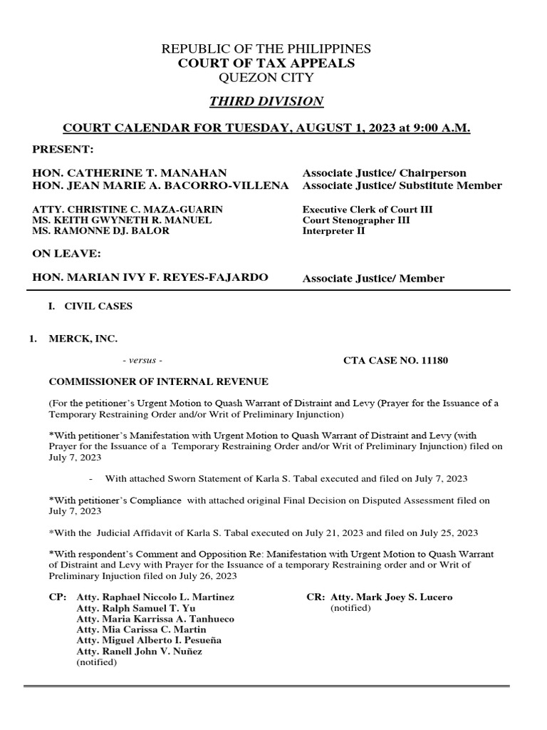 Republic of The Philippines Quezon City: Court Calendar For Tuesday