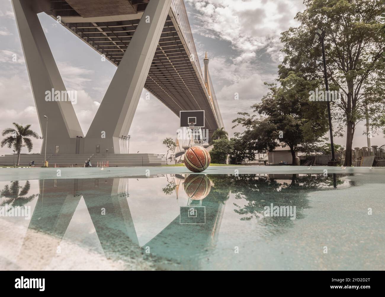 Basketball Backboard and Basketball Hoop with Reflection Water after