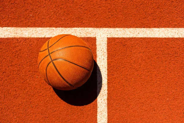 Basketball Laying on the Court Wooden Floor with Reflection Stock