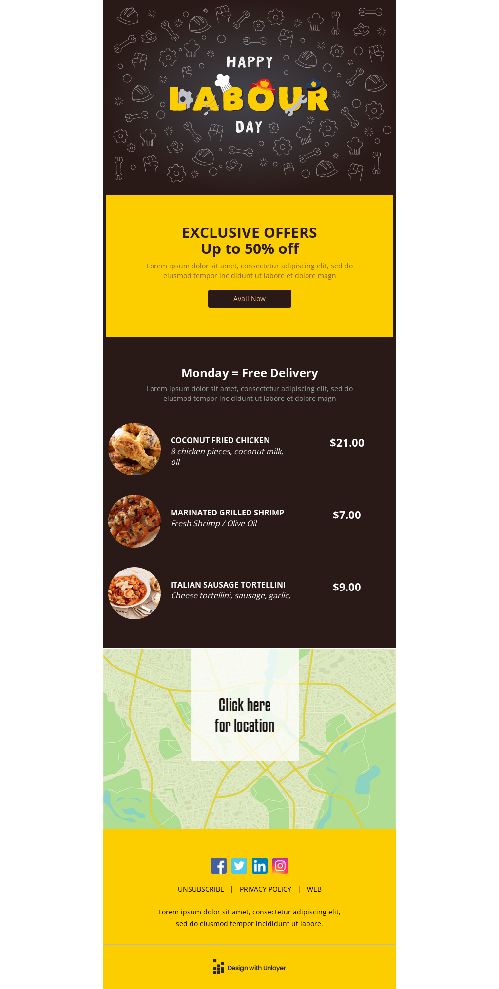 Labor Day Discounts on Entire Menu Email Template Unlayer
