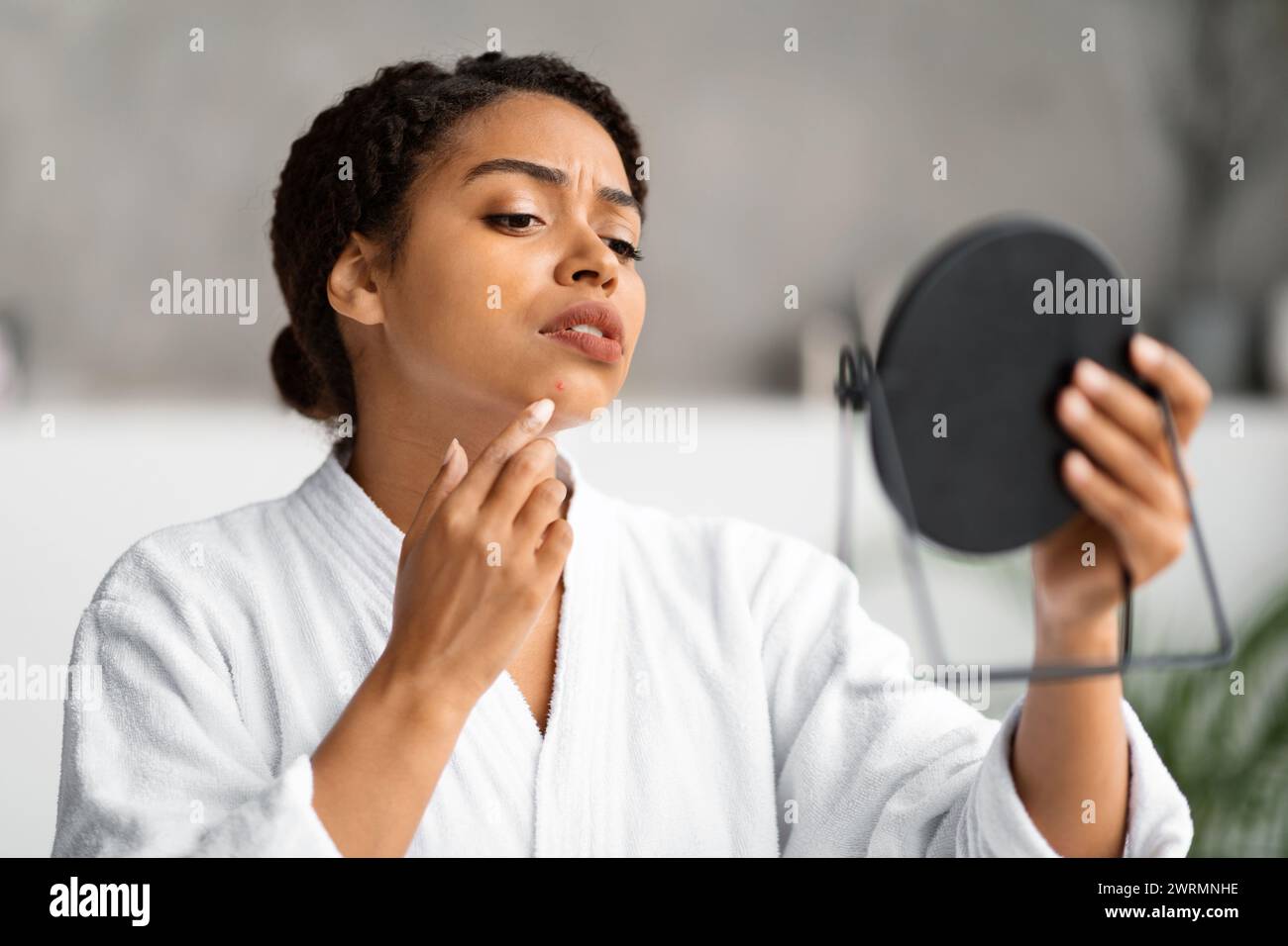 Focused black woman examiningblemish while looking in hand