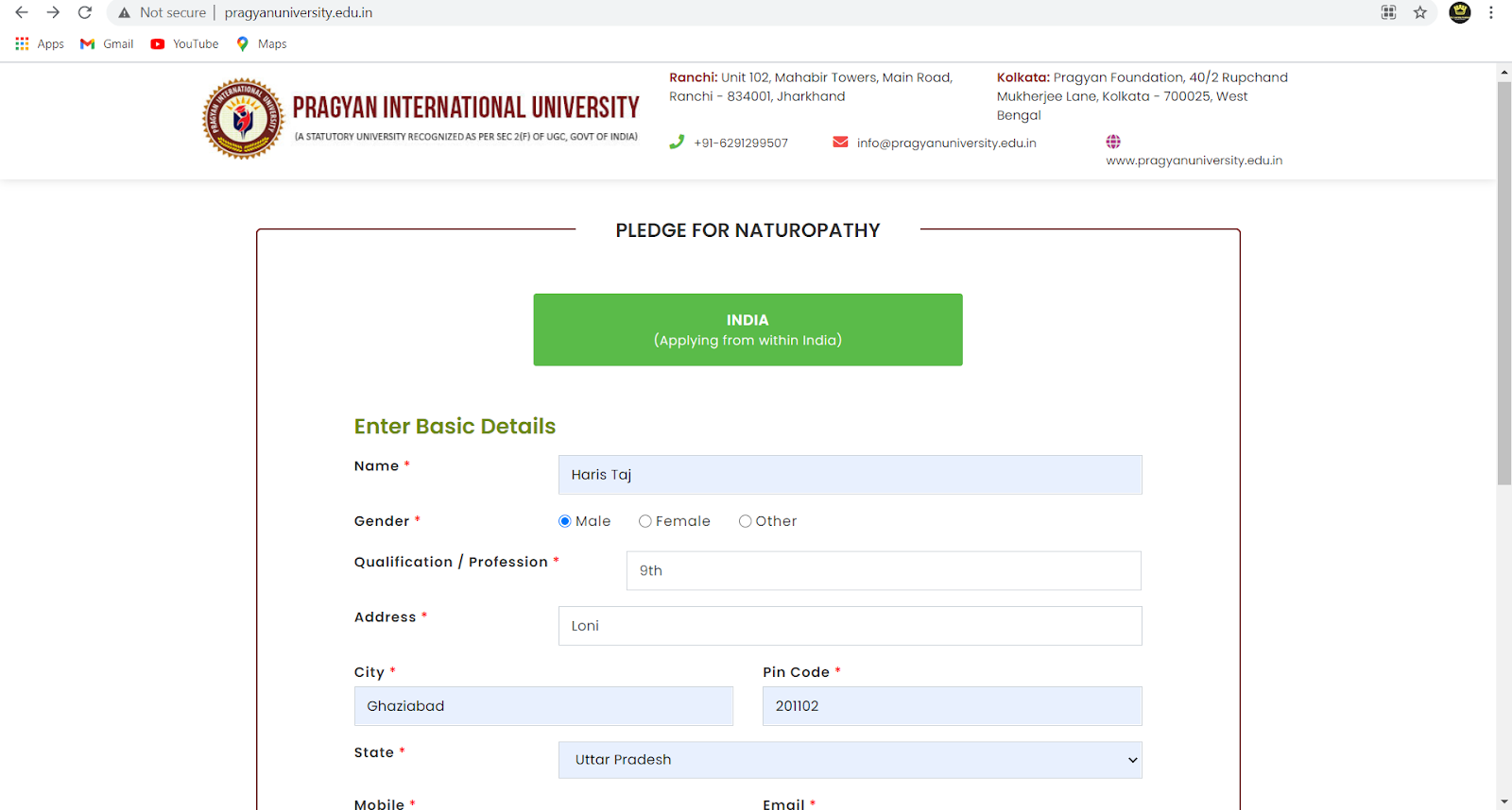 Admission form for Naturopathy(Diploma Certificate) Shakuntalam