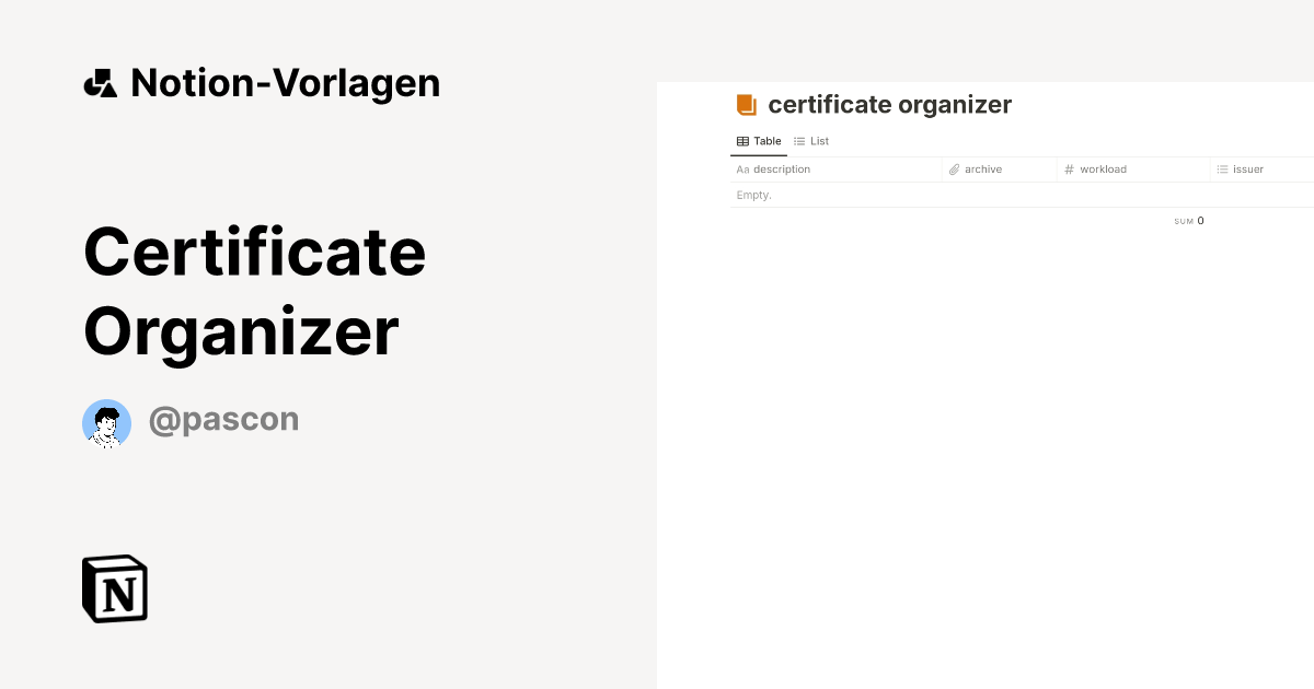 Certificate Organizer Vorlage Notion Marketplace