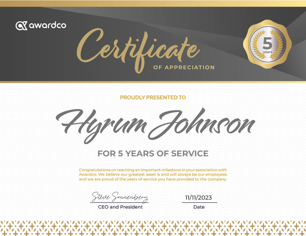 Editable Years of Service Award Recognition Certificate 5 Year Work
