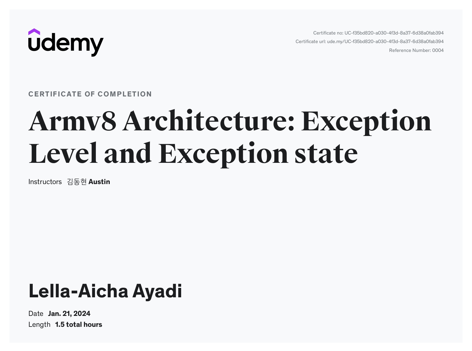 Udemy Course Completion Certificate of Armv8 Architecture: Exception