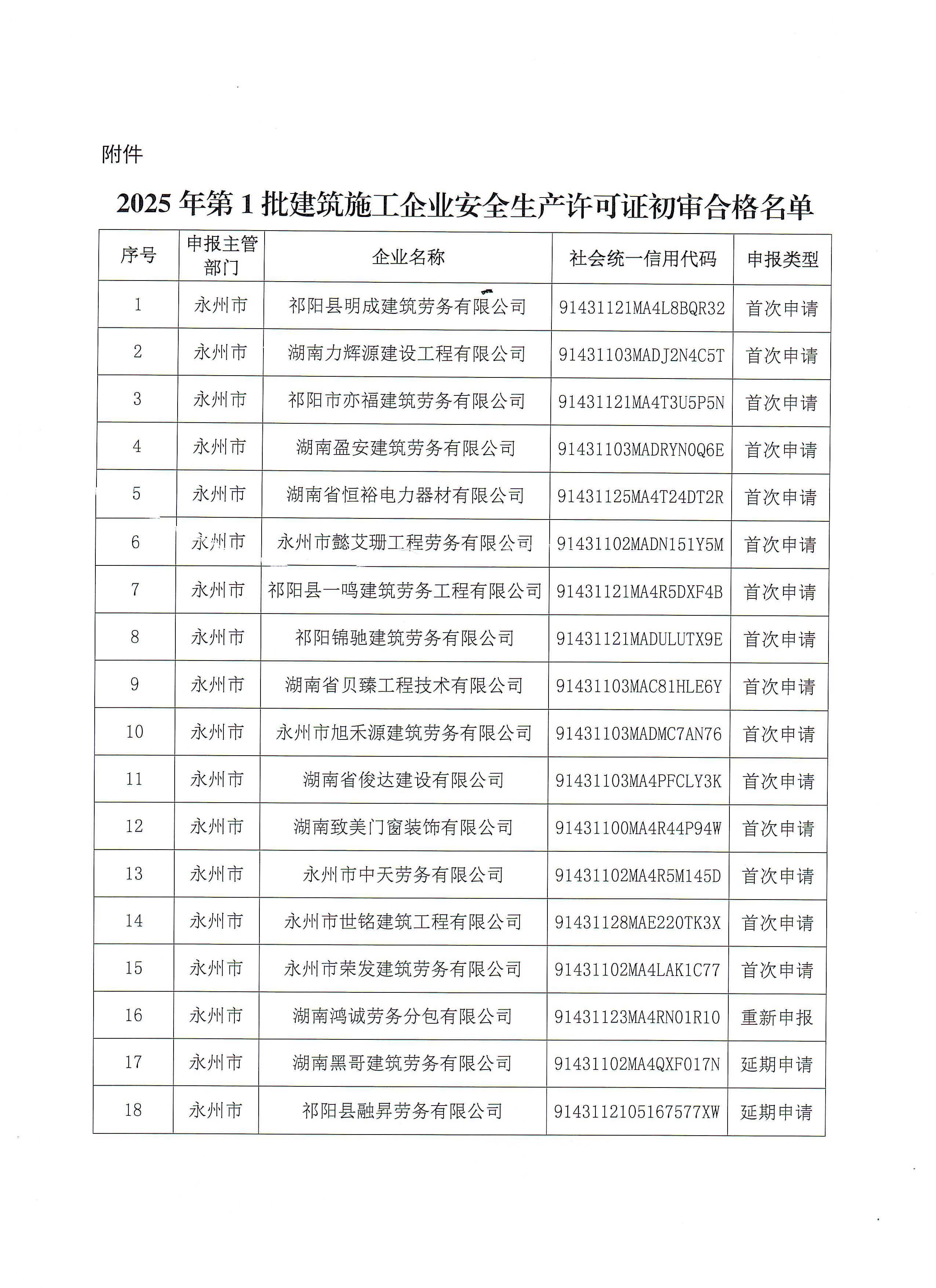 关于2025年第1批建筑施工企业安全生产许可证初审合格名单的公示 通知 市住房和城乡建设局 永州市人民政府