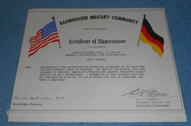 1988 BAUMHOLDER MILITARY Community Certificate of Appreciation US Army