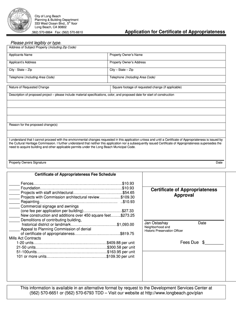 Fillable Online CERTIFICATE OF APPROPRIATENESS FORM and CERTIFICATE