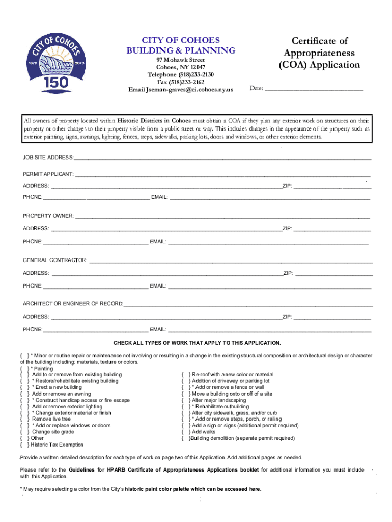 Fillable Online Certificate Of Appropriateness City of Cohoes Fax