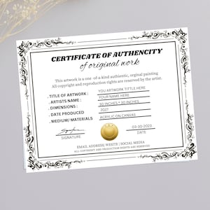 DIY Certificate of Authenticity for Artwork Brown Gold Customizable A