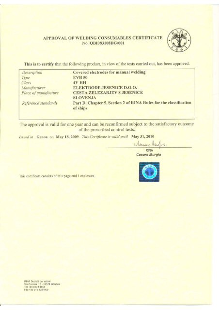 APPROVAL OF WELDING CONSUMABLES CERTIFICATE N0