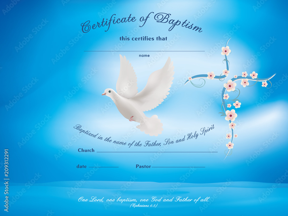 Certificate Baptism Template With Dove And And Flowery Frame On Blue