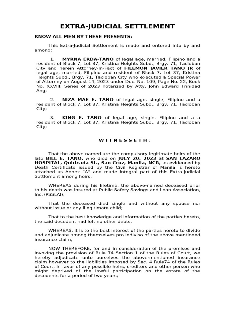 EJS Insurance Claim and Bank Deposit (Minors) INSURANC CLAIM ONLY