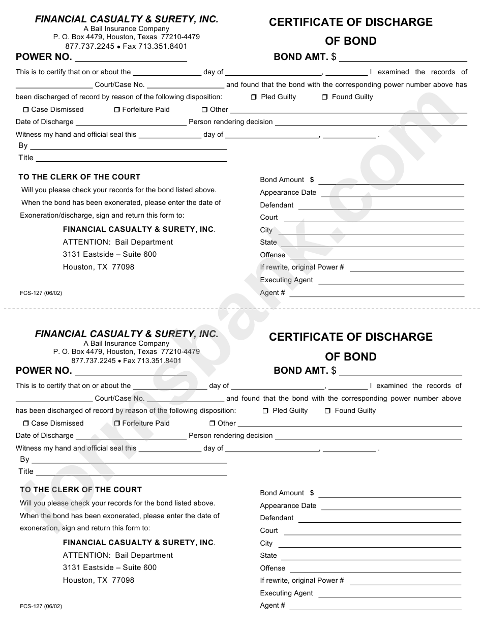 Form Fcs 127 Certificate Of Discharge Of Bond Financial Casualty