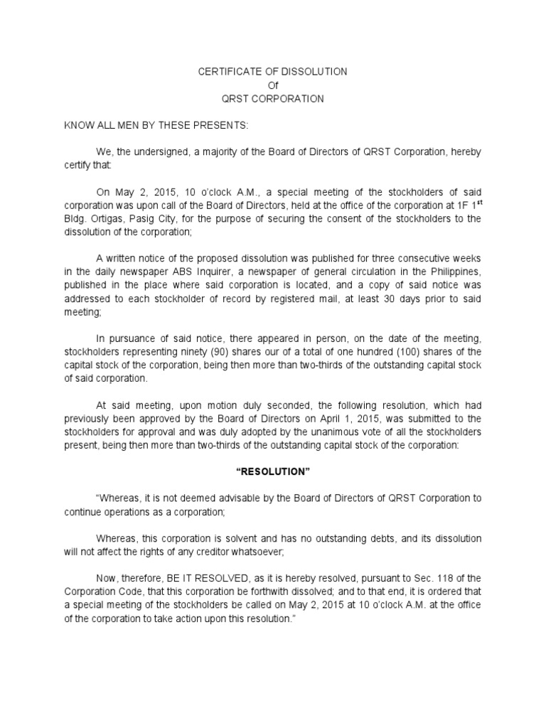 Certificate of Dissolution of Corporation Free Download