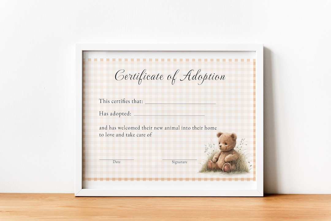 Adoption Certificate for Stuffed Animal Teddy Bear Adoption