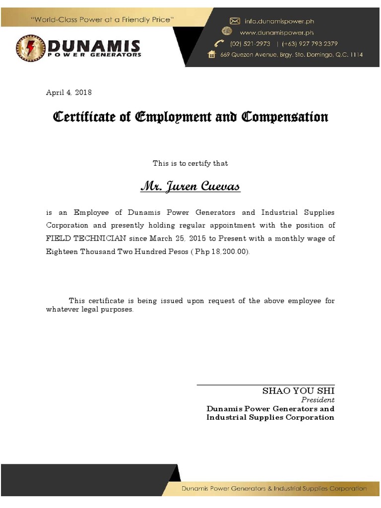 Certificate Of Employment With Compensation