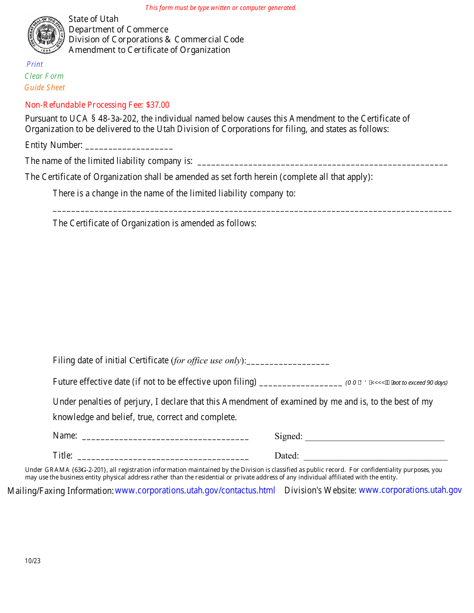 Utah Amendment to Certificate of Organization Download Fillable PDF