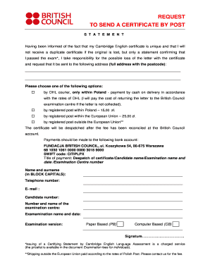 Fillable Online britishcouncil REQUEST TO SEND A CERTIFICATE BY POST S