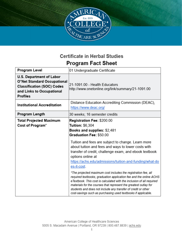 Certificate in Herbal Studies Fact Sheet ACHS PDF