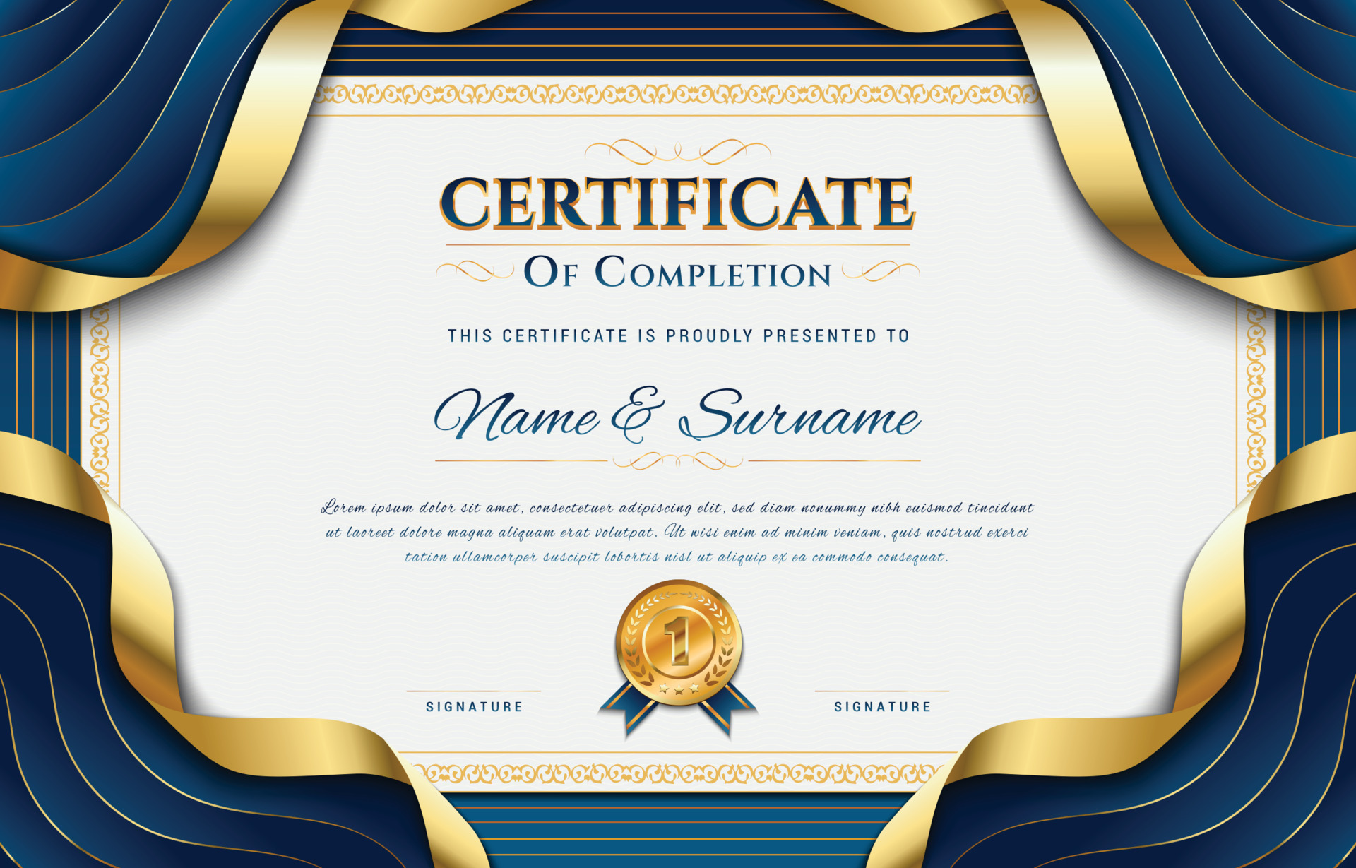 Free Blue and Gold Certificate with Badge Template GraphicsFamily