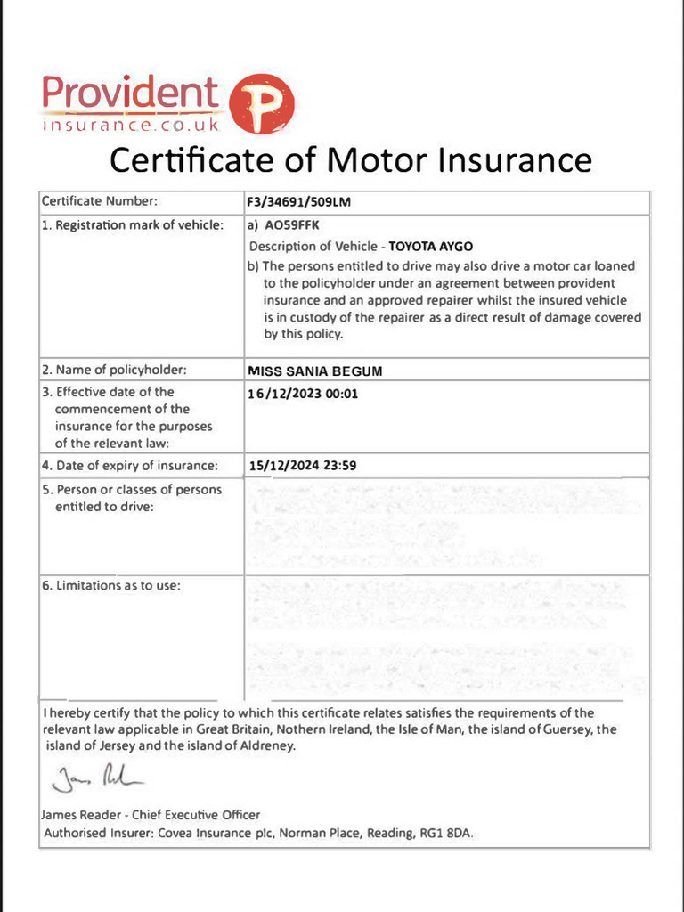 Car Insurance Certificate Template UK